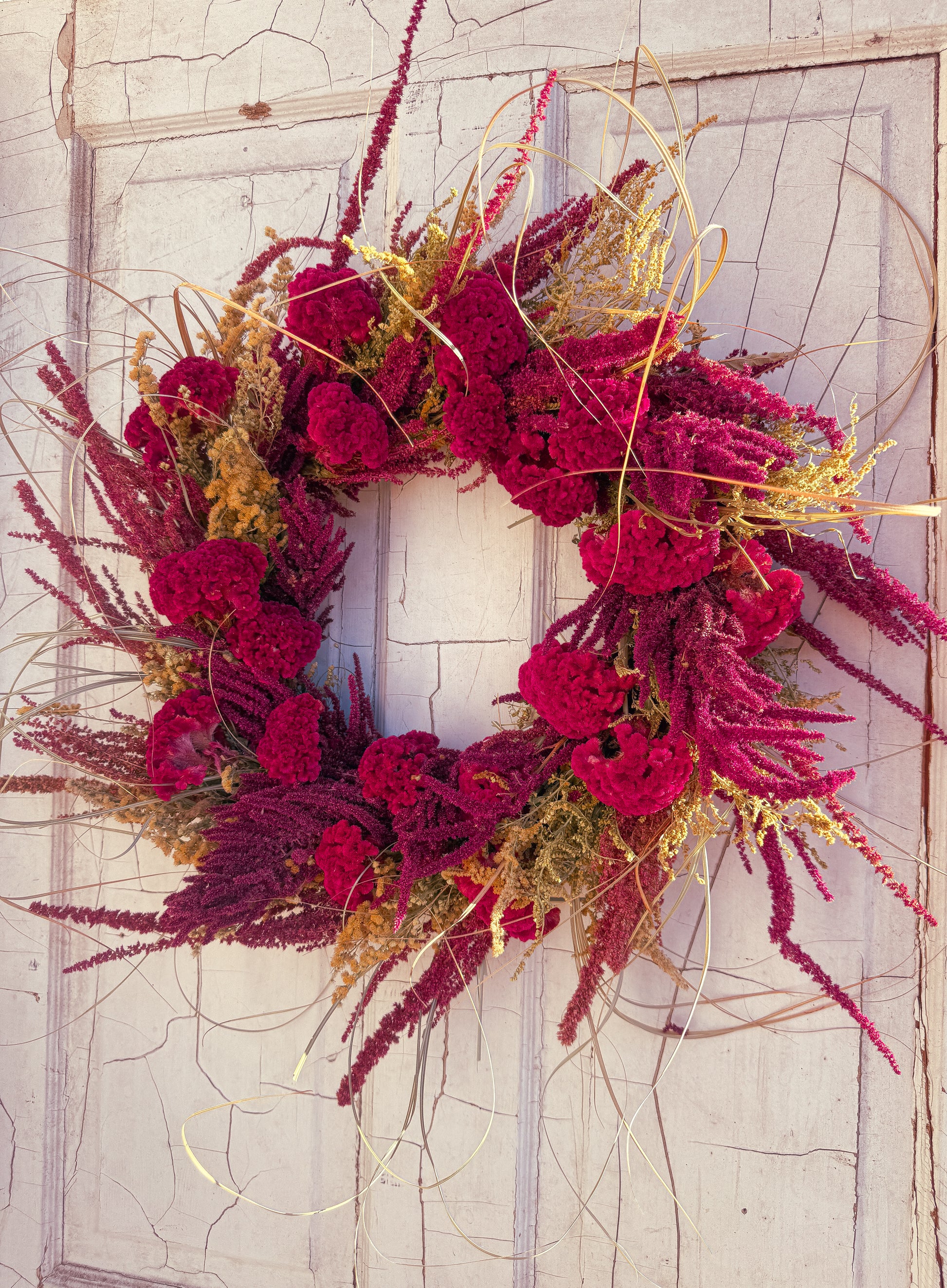 Wreaths are one of a kind and made with flowers that were locally grown, harvested, dried and arranged. They are fragile but can last for years and years with the proper care. Recommend hanging inside for your enjoyment 🖤