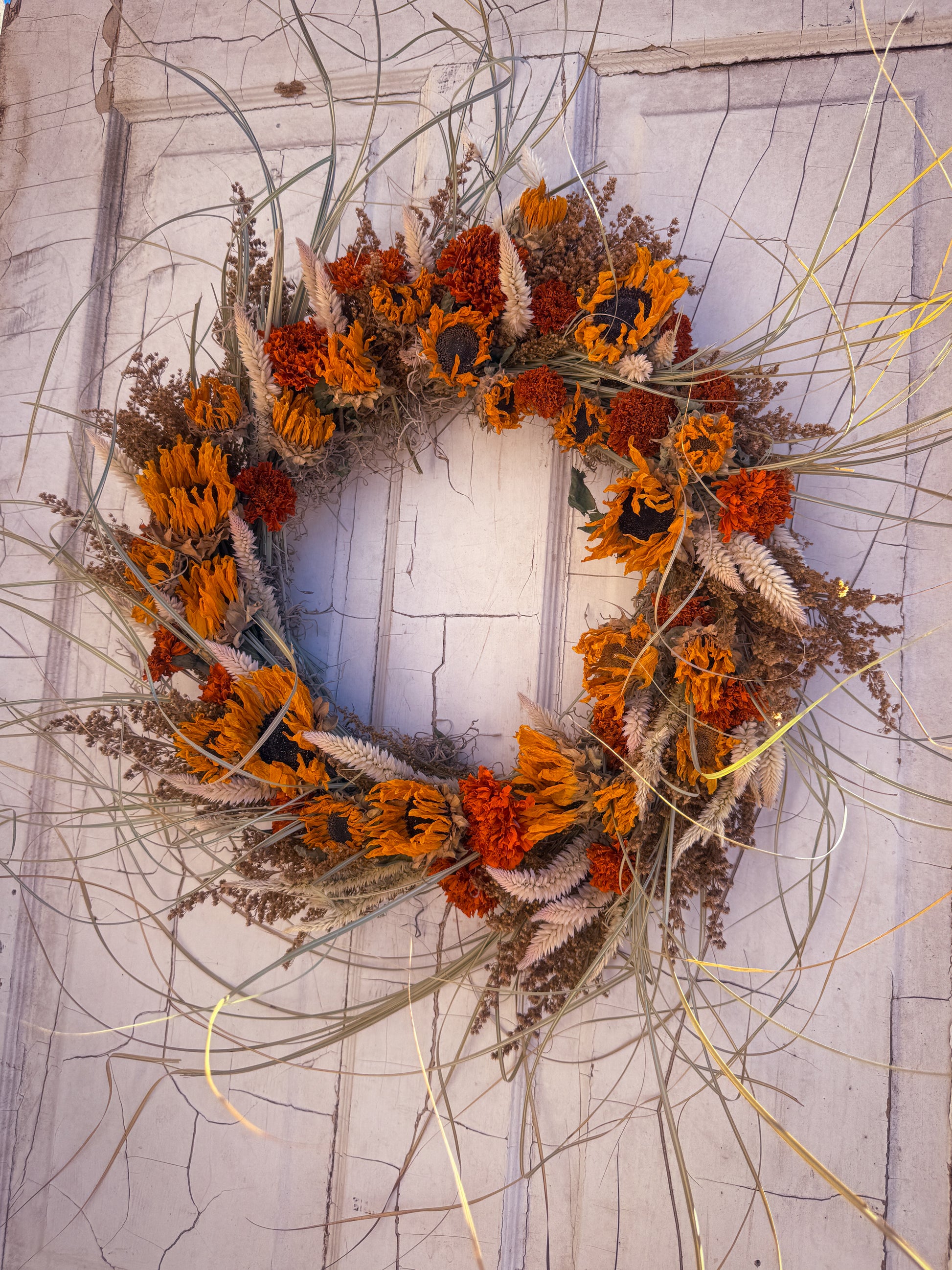 Wreaths are one of a kind and made with flowers that were locally grown, harvested, dried and arranged. They are fragile but can last for years and years with the proper care. Recommend hanging inside for your enjoyment 🖤