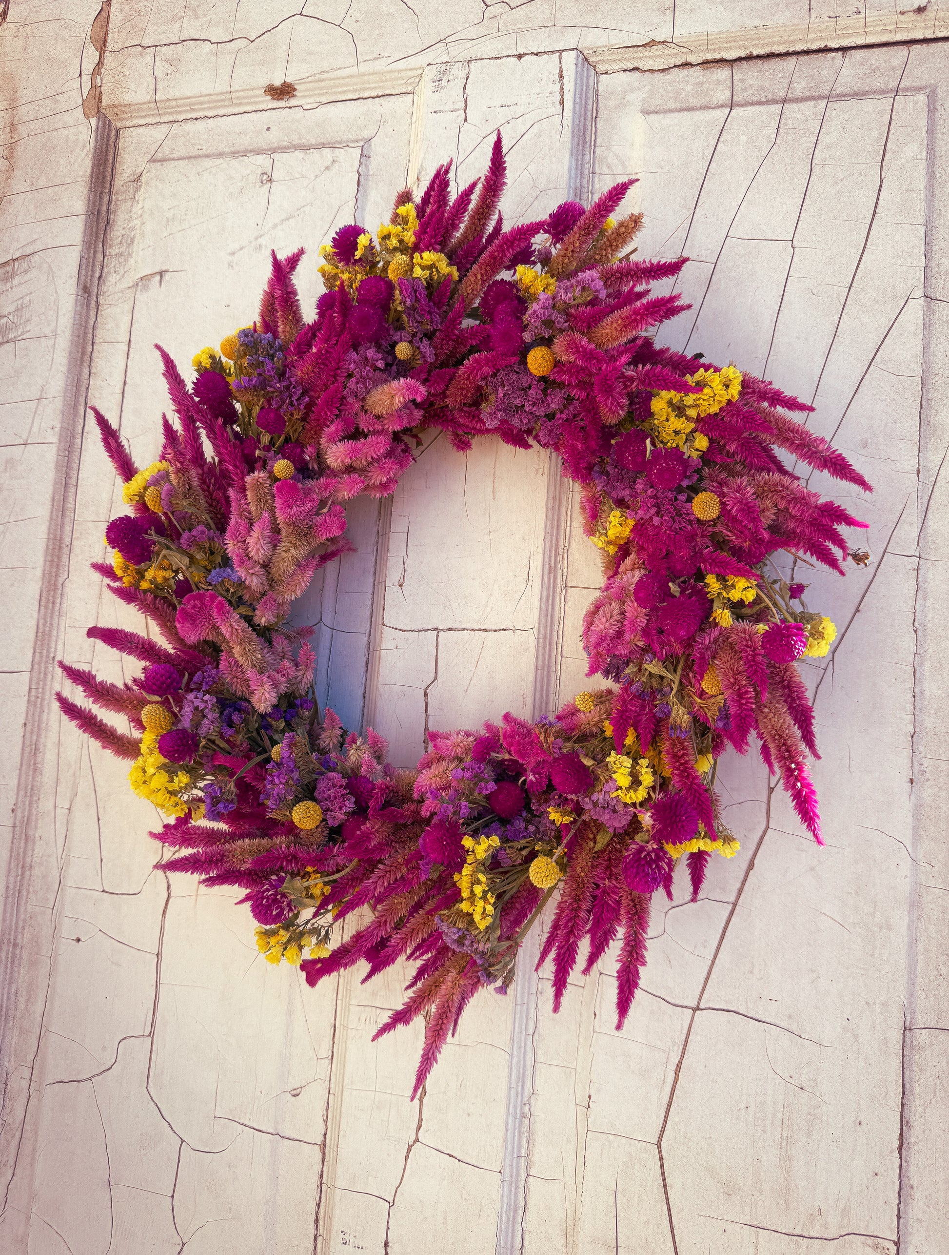 Wreaths are one of a kind and made with flowers that were locally grown, harvested, dried and arranged. They are fragile but can last for years and years with the proper care. Recommend hanging inside for your enjoyment 🖤