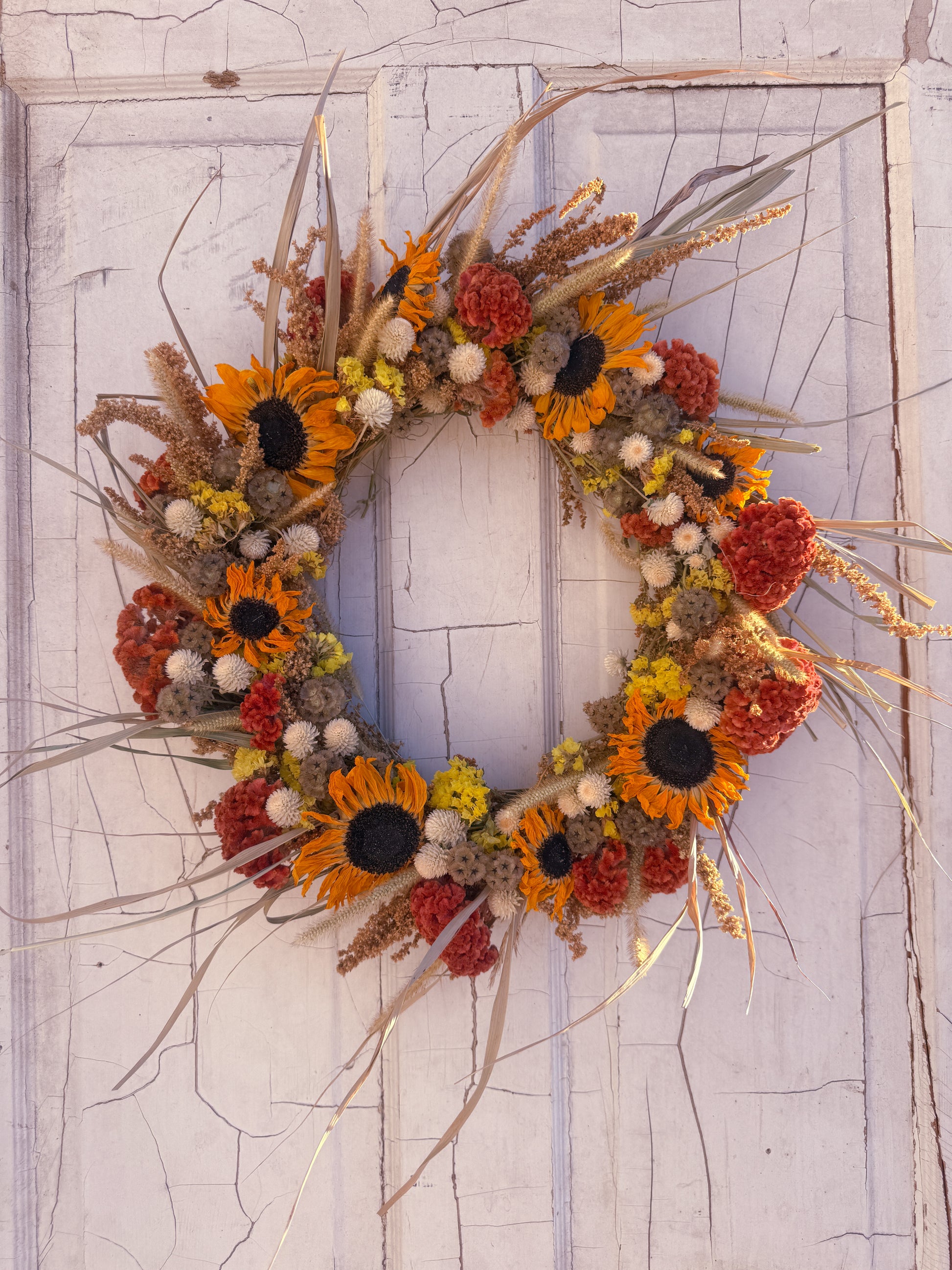 Wreaths are one of a kind and made with flowers that were locally grown, harvested, dried and arranged. They are fragile but can last for years and years with the proper care. Recommend hanging inside for your enjoyment 🖤