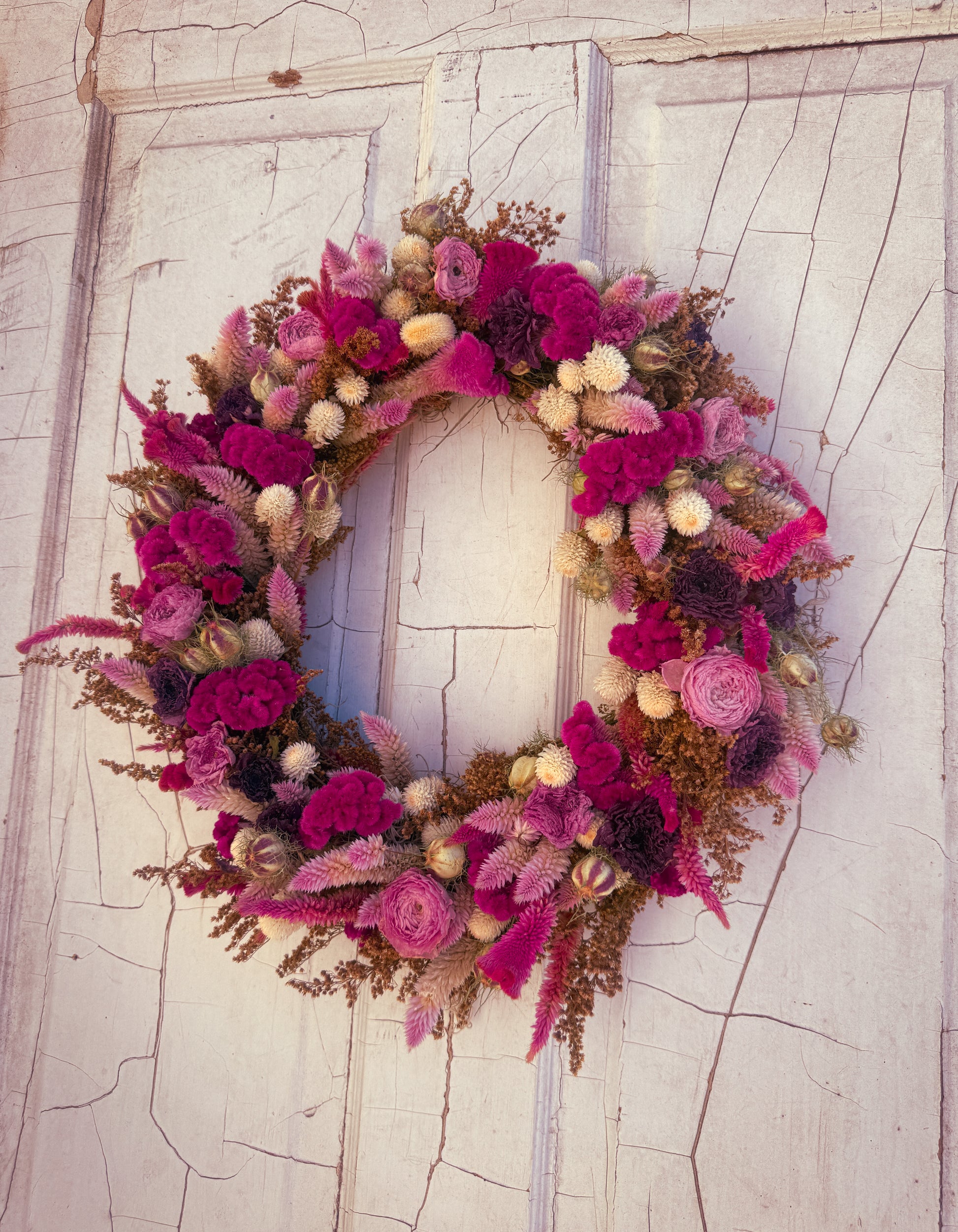 Wreaths are one of a kind and made with flowers that were locally grown, harvested, dried and arranged. They are fragile but can last for years and years with the proper care. Recommend hanging inside for your enjoyment 🖤